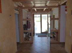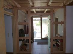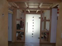 Einbau einer Glaspendeltür als Abtrennung zwischen Eingangsbereich und Wohnbereich, "Windfangtür". Die Tür lässt sich praktischerweise in beide Richtungen öffnen.
