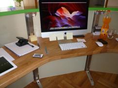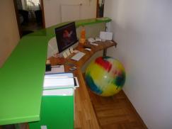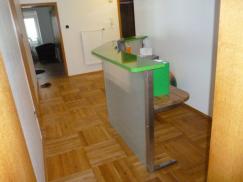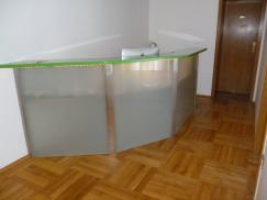 Empfangstheke für Praxis. Stahl/ Holzkonstruktion mit VSG -Glas satiniert, Arbeitsplatte in Eiche massiv lackiert. Abdeckung aus MDF-Platte hergestellt, lackiert nach Kundenwunsch.
