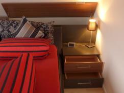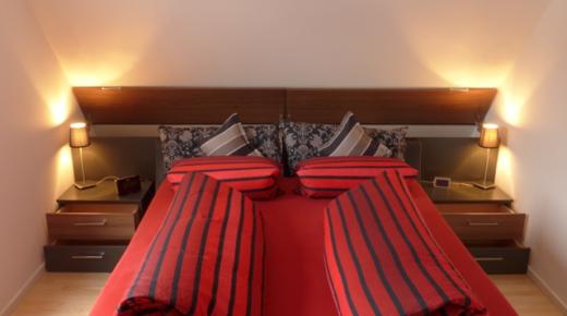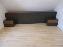 1. Einbauschrank in einer Dachschräge, aus MDF-Platten (lackiert nach Kundenwunsch) mit Klappdeckel in Echtholz Nussbaum furniert. Seitlich angepasste Nachtkästen. Somit wurde sehr viel Stauraum geschaffen.