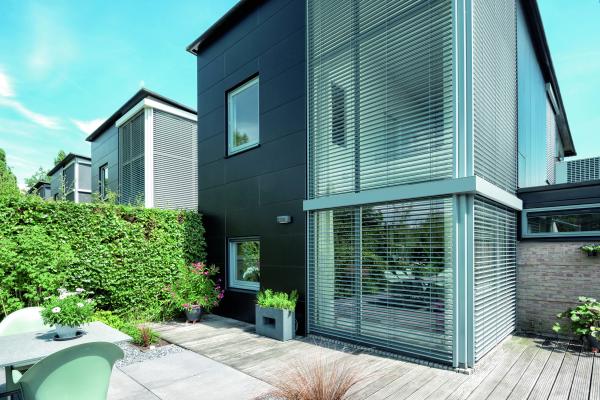 Raffstorenlamellen wirken herabgefahren sehr filigran und verleihen der Fassade eine pure und flache Optik.